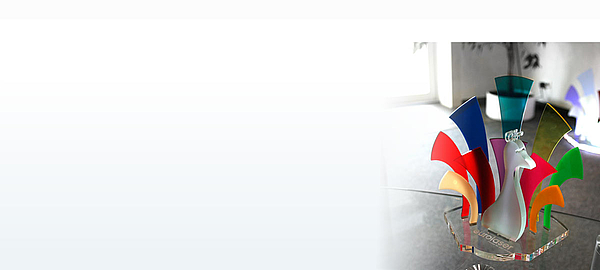 We have used a peacock sample cut with laser to illustrate as vividly as possible the abundance of colours offered by acrylic glass. It consists in total of 12 individual parts that are put together quite simply by interlocking them with each other. The head and body of the peacock are made of 10 mm frosted acrylic. The LEDs integrated in the bottom of this part give it that extra flair.